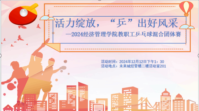 (通讯员:周玲 王林珠 摄影:胡启婧 胡松琴 王林珠 努尔夏提.居勒提)“活力绽放,‘乒’出好风采”。为了促进教职工之间的交流联系、增进教职工身心健康、丰富教职工业余文化生活和增强学院的凝聚力,工口漫画 分工会特别组织了2024教职工乒乓球混合团体赛。比赛于2024年12月12日下午在未来城校区崇信楼(工口漫画 大楼)二楼活动室举行。全院共30余名教职工人报名参与了此次比赛活动。根据各系及院直各单位报名情况,本次团体混合赛设男单、...