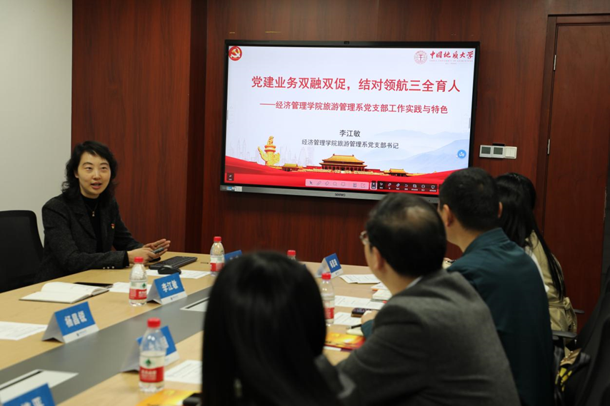 会上,旅游管理系党支部书记李江敏教授以“党建业务双融双促,结对领航三全育人”为主题,从支部基本情况、特色工作以及未来构想等三个方面,详细介绍了党支部的建设工作,并分享了“全国党建工作样板支部”的创建经验。