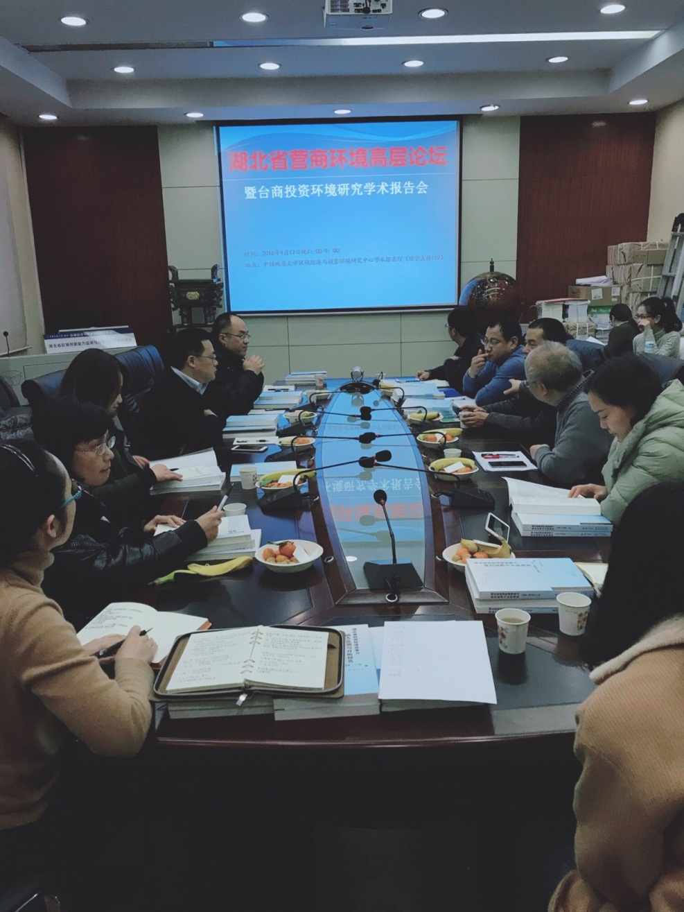 (通讯员吴磊、谢伟伟)2018年1月17日,“湖北省营商环境高层论坛暨台商投资环境研究学术报告会”在工口漫画 区域经济与投资环境研究中心学术报告厅举行。湖北省台办王光斌处长、朱琨科长,经管学院杨树旺副院长、区域经济与投资环境研究中心邓宏兵教授,以及相关研究领域的专家、师生代表共计30余人参加了会议。邓宏兵教授主持了会议。