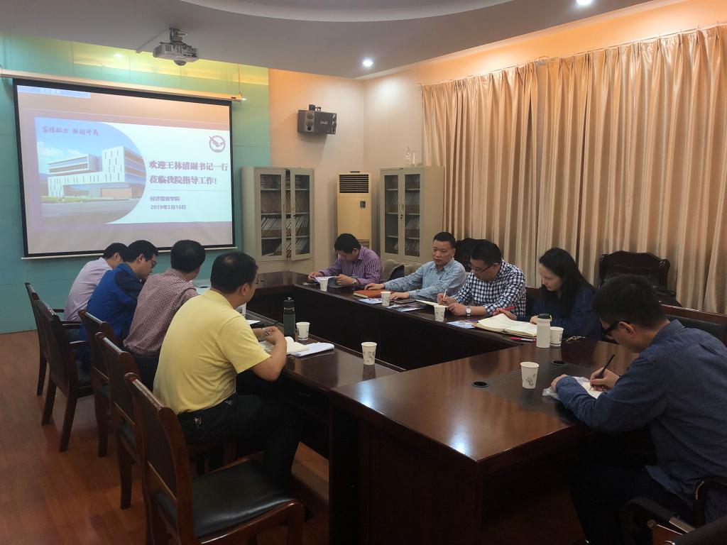 5月16日,校党委副书记王林清,学生工作处处长邬海峰,就业创业指导处处长严嘉,校团委副书记朱荆萨(主持工作)一行来我院就纵向设置辅导员试点工作开展调研。学院党委书记杨昌锐,党委副书记沈波,院长助理程胜、侯俊东,旅游管理系系主任肖拥军、经济系党支部书记齐睿及学工组全体辅导员参与座谈。