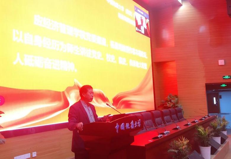 杨昌明教授将校史院史教育有机融入党史学习教育,引领学院师生知史爱党、知史荣校。杨昌明教授结合自身求学和工作经历,以图文并茂的形式再现了学校自建校以来的风雨历程和辉煌巨变,讲述了学校始终与祖国同行同向,坚持为党育人、为国育才的使命担当,分享了一代又一代地大人坚守校训精神、不畏艰难困苦、砥砺奋进前行的动人故事,并高度赞扬了经管学院师生白手起家、艰苦创业,奋力开创学校人文社科新局面的精神品质和重要贡献。