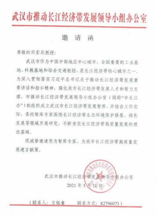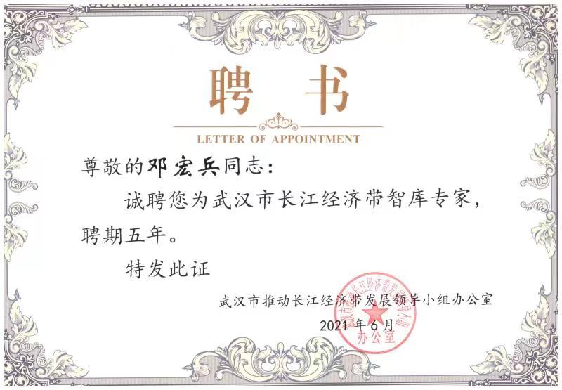 (通讯员王彦闻)近日,我院国贸系邓宏兵教授被武汉市推动长江经济带发展领导小组办公室聘为武汉市长江经济带智库专家,聘期五年。