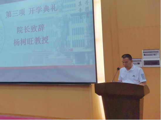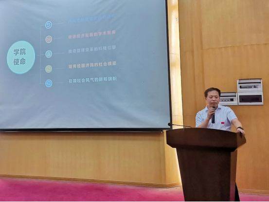 典礼结束后,院党委书记杨昌锐为全体新同学讲授开学第一课——《经管学院文化介绍》。他主要从学院院训、院徽、院风、使命、愿景五个方面对学院文化进行深入解读,并与新生分享了“学习工作十观”。希望全体新生能够在良好的学院氛围下,努力拼搏进取,树立正确的人生观、价值观和世界观。