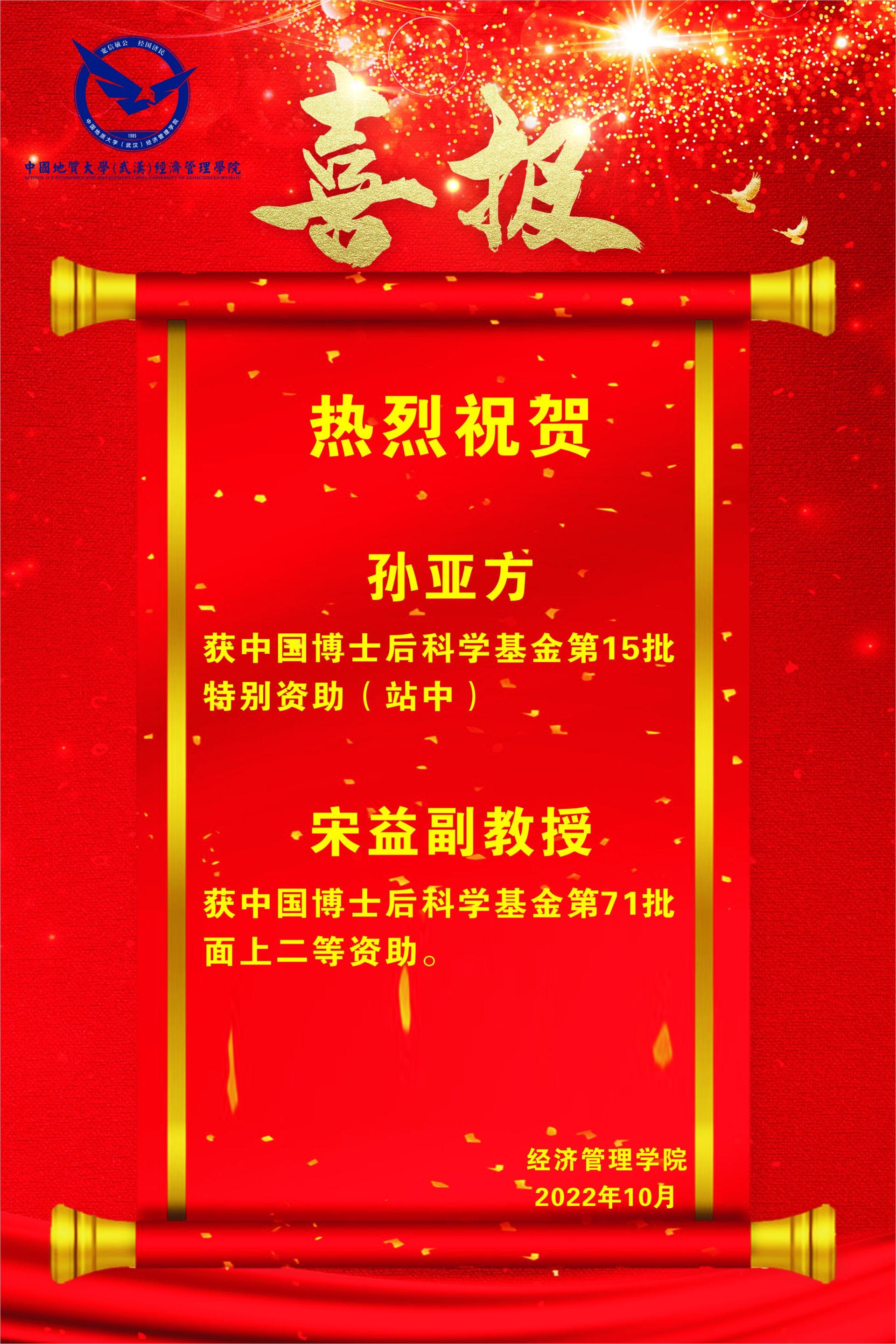 近日,中国博士后科学基金会公示了2022年度中国博士后科学基金特别资助名单和中国博士后科学基金第71批面上项目资助名单。我院获批2项资助,其中孙亚方获得第15批中国博士后科学基金特别资助(站中),宋益副教授获得中国博士后科学基金第71批面上二等资助。