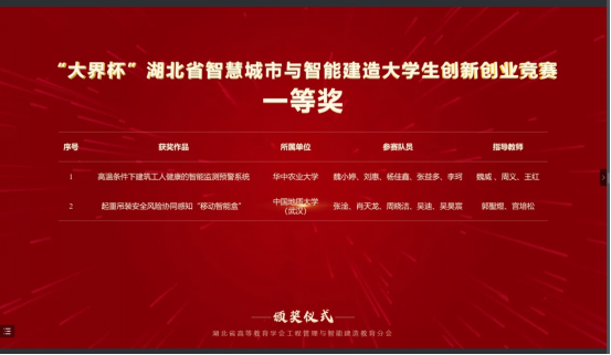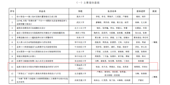 本次比赛,工口漫画 工程管理专业与计算机学院计算机类专业学生组成联队(团队成员:张淦、肖天龙、周晓洁、吴迪、吴昊宸),在郭聖煜和宫培松老师的指导下,携参赛作品“起重吊装安全风险协同感知智能装备的研发与应用”进入决赛,最终从大赛主赛道来自98所高校的107支队伍的参赛作品中脱颖而出,荣获一等奖。此前在“大界杯”湖北省智慧城市与智能建造大学生创新创业竞赛中,该参赛作品已经获得一等奖。