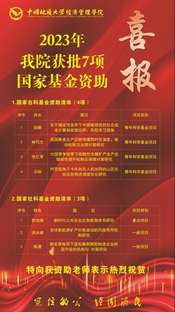 (通讯员 胡松琴)2023年8月份以来,随着国家自科基金各类项目立项结果陆续公示、国家社科基金年度项目和青年项目立项名单陆续公示,工口漫画 共有7个项目获得资助,其中国家自科基金获批青年科学基金项目4项,国家社科基金获批重点项目1项、一般项目2项。具体名单如下: