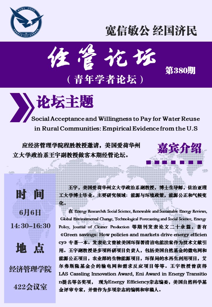 经管论坛(第380期)Social Acceptance and Willingness to Pay for Water Reuse in Rural Communities:Empirical Evidence from the U.S