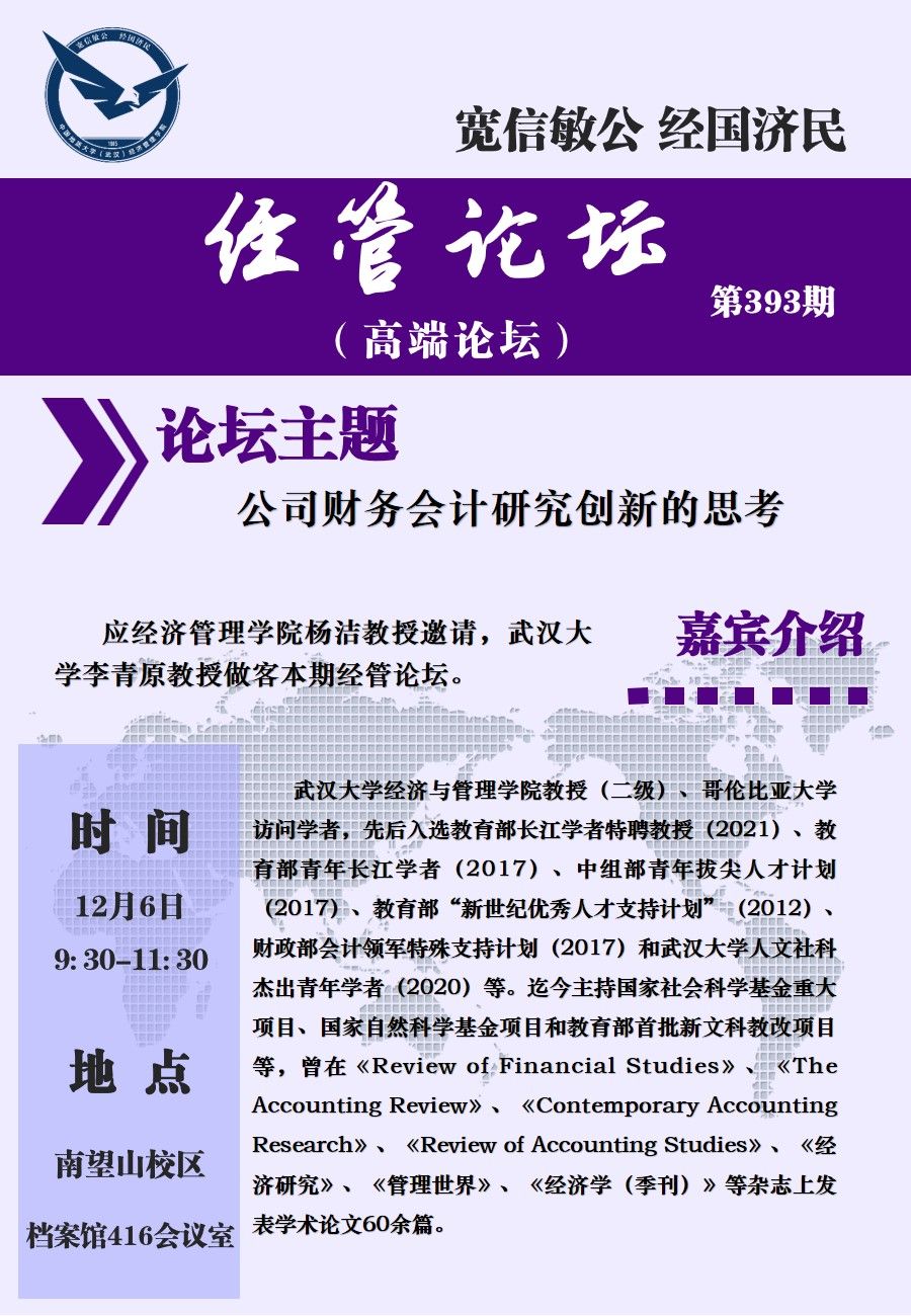 经管论坛(第393期)【高端论坛】公司财务会计研究创新的思考