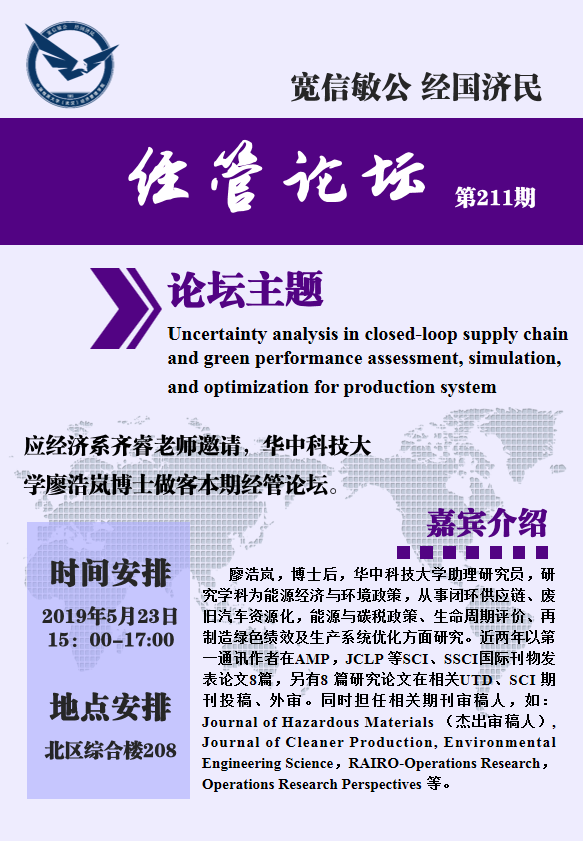 经管论坛(第211期)Uncertainty analysis in closed-loop supply chain and green performance assessment, simulation, and optimization for production system