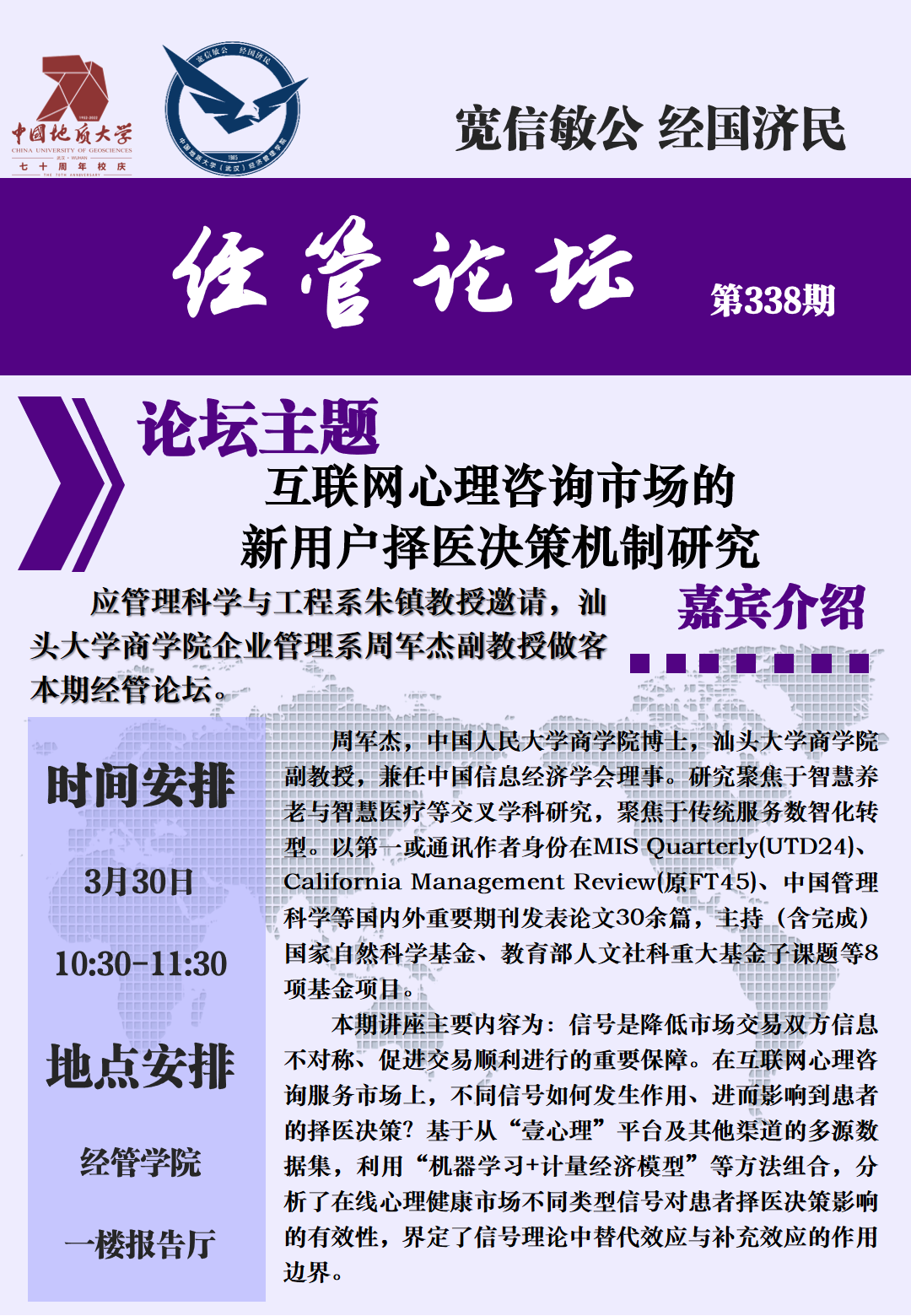 经管论坛(第338期)互联网心理咨询市场的新用户择医决策机制研究