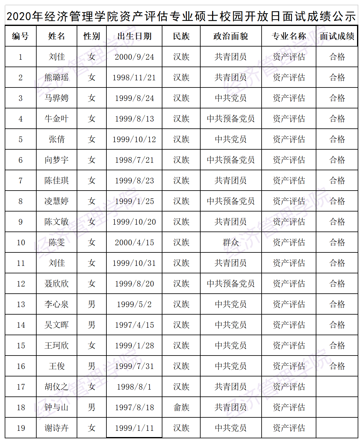 2020年工口漫画 资产评估专业硕士校园开放日面试成绩公示