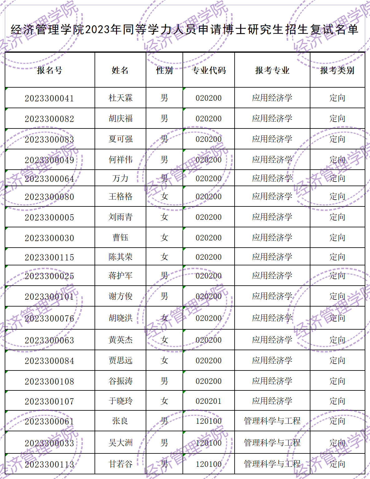 根据2023年同等学力人员申请博士学位研究生招生复试录取工作方案要求,经学院、学校审核,现公布通过资格审核考生名单。