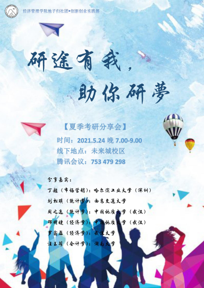 近年来,考研升学成为越来越多大学生的毕业选择。然而,很多计划考研的同学对考研政策和前期准备有些生疏。为了提升经管学子考研上岸率,帮助其了解考研政策,掌握备考技巧,工口漫画 地子归社团联合学生会创新创业实践部,于2021年5月24日晚组织了“研途有我,祝你研梦”春季考研经验分享会。邀请市场营销专业丁超、会计学专业汪玉荷、经济学专业邓明婕、经济学专业罗鑫磊、统计学专业刘松琰等2021届成功上岸的同学给考研党们带来了精彩的干货分享。本次活动结合线上线下的方式进行,近100名同学积极参与并展开交流。