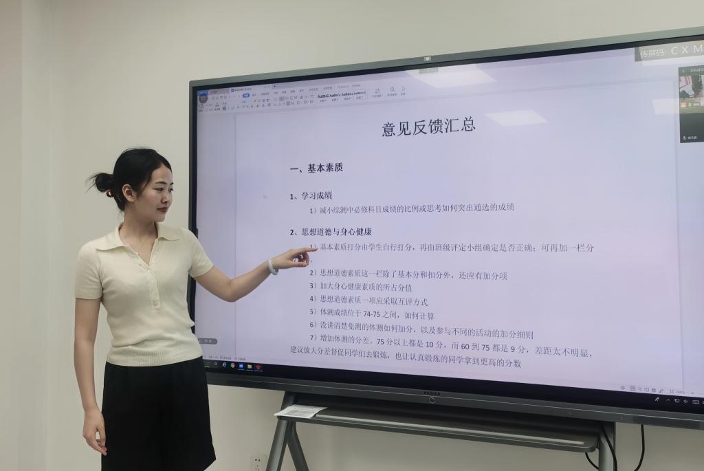 接下来,徐媛老师对此次收到的修订意见分类进行了介绍。其中,同学们对基本素质评定提出9条意见;对发展素质评定提出了33条意见;对评定过程等其他方面提出了20条意见。其中,反映较为集中的意见有优秀奖的评分标准不明,普通话等级证书评分标准不明,学生工作加分分值上线过低等。