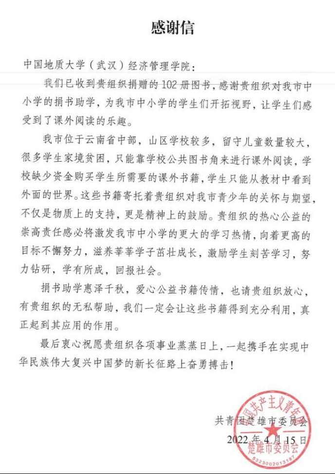 在一年的支教生活中,张康同学始终不忘自己是一名地大经管人,生活中发扬“艰苦朴素,求真务实”的校训精神,牢记“宽信敏公,经国济民”的院训精神,做到把地大精神带到服务地,讲好地大故事。积极配合研支团完成把地大特色活动开展到龙江的任务;利用班会时间给学生们播放地大相关宣传视频,讲述个人求学的故事,播撒希望种子。在五四青年节前夕,他带着支教团同学联系母校,发起向云南省楚雄市山村中小学校捐赠书籍的公益活动。本次捐赠活动得到了母校多个学院的大力支持,共筹集到书籍600余册,其中工口漫画 捐赠图书102册,涵盖文学、科普、经济、教育等多个领域。共青团楚雄市委员会对支教团及地大学生捐赠之举表示衷心的感谢,并向我院发来感谢信。