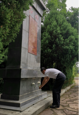 “每平方米至少倒下10名烈士,抓起一把泥土都能攥出血来啊!”讲解员讲到此处,在场党员无不动容,一时间热泪盈眶。大家在红田惨案遗址前默哀,献上鲜花并鞠躬致敬。
